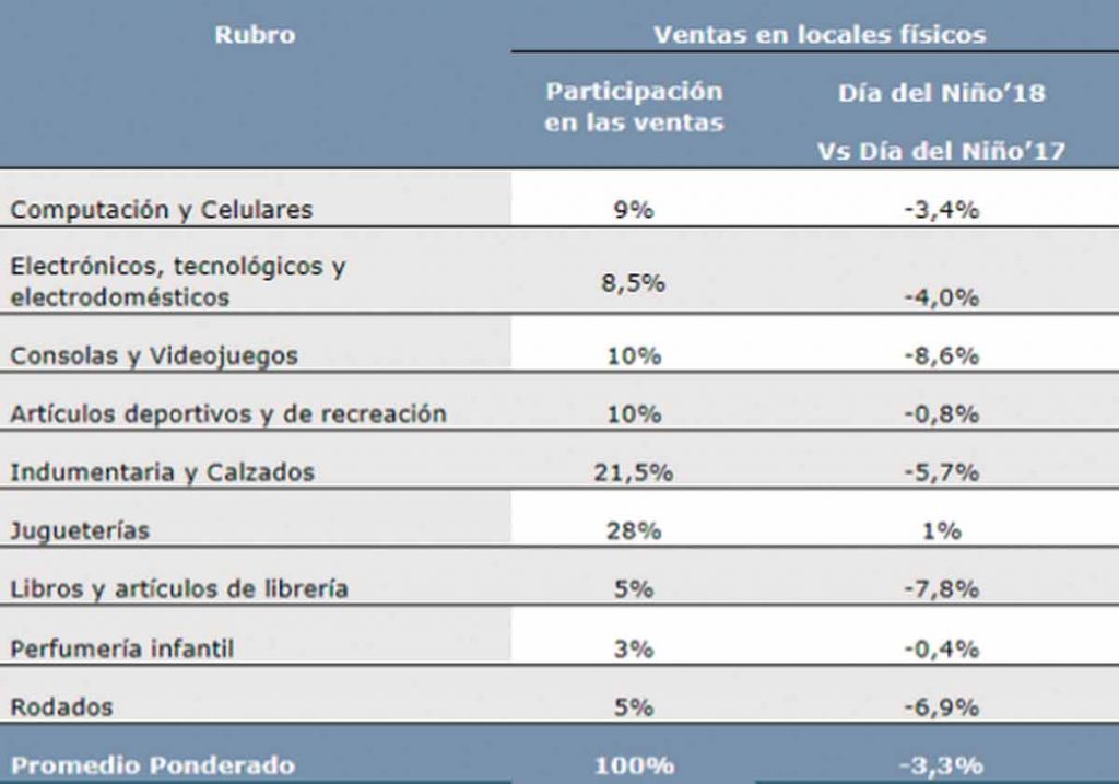 Precisaron luego que de las nueve grandes ramas que componen la canasta de ventas por el Día del Niño, en todos se vendió menos que en 2017, salvo en el rubro “Juguetes” donde la demanda creció 1 por ciento. “Fueron muy importantes las promociones y campañas que se realizaron en este ramo, para fortalecer el consumo”, recalcaron.