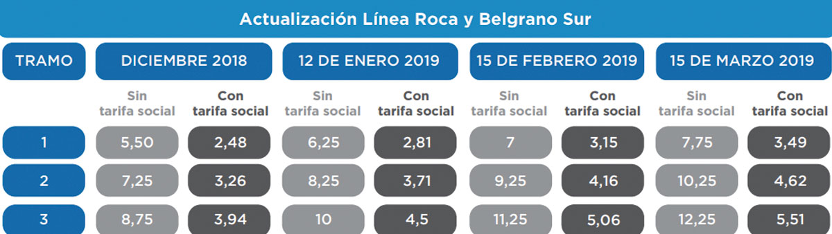 En el caso de los trenes, la tarifa mínima de las líneas Mitre, Sarmiento y San Martín aumentarán 1,25, con lo que pasarán a costar 10 pesos; en el Roca, Belgrano Sur y Urquiza la suba será de 0,75 centavos (6,25), y el Belgrano Norte subirá 1 peso lo que representará un boleto mínimo de 5,75.