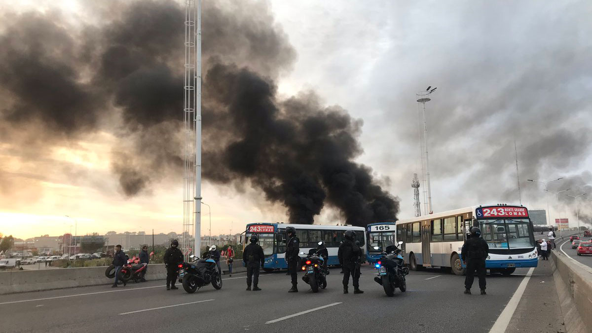 Choferes de Expreso Lomas (que comprende a las líneas 243, 165 y 112) cortan esta mañana Puente La Noria, en el marco del paro del 30 de abril y con el objetivo de visibilizar el conflicto que los aqueja desde hace semanas.