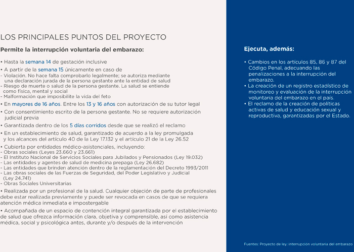 El proyecto contempla la despenalización del aborto hasta el cumplimiento de la semana 14 de gestación. Establece también la creación de un registro estadístico de monitoreo y evaluación del aborto en todo el país. Modifica los artículos del Código Penal que contemplan sanciones para quienes practican y quienes se someten a un aborto.