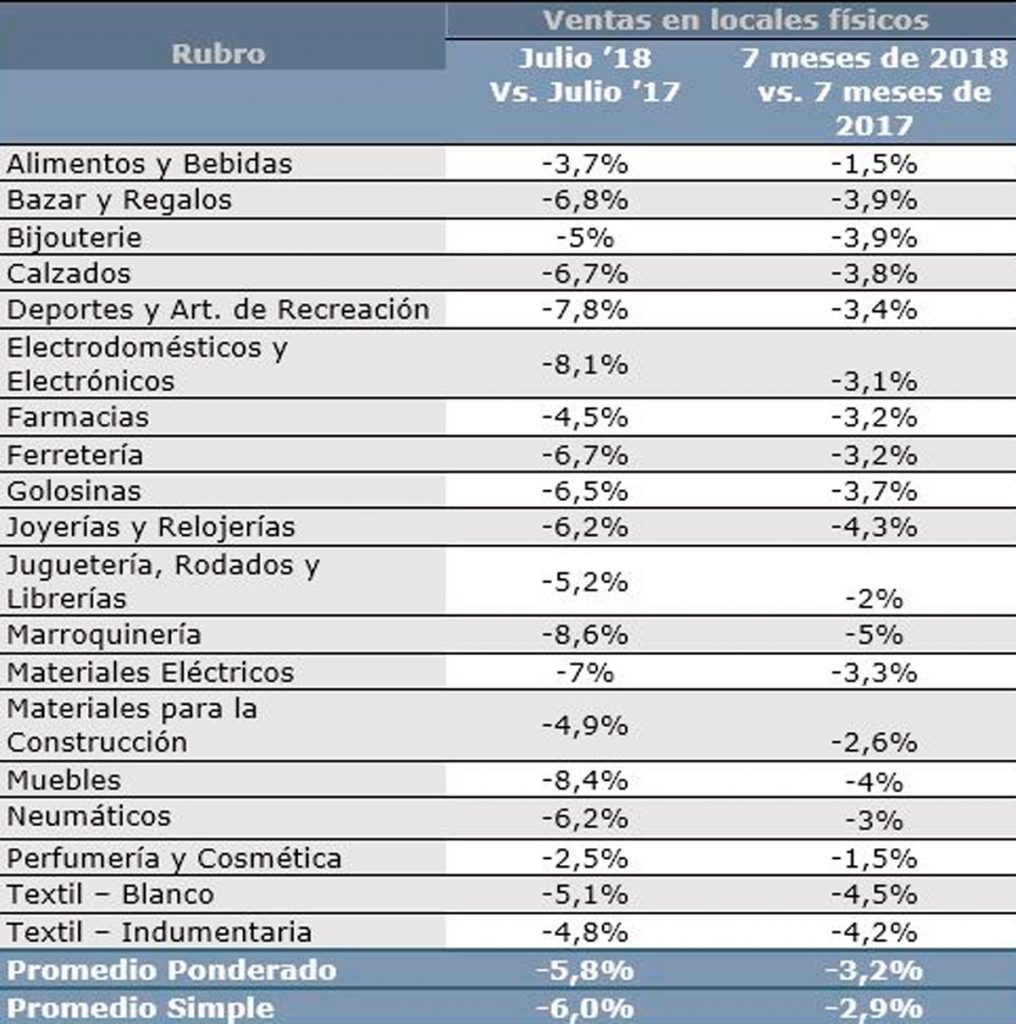 La Confederación Argentina de la Mediana Empresa (CAME) anunció que las ventas minoristas finalizaron julio con una caída de 5,8 por ciento frente a igual mes del año pasado. Fue la mayor caída anual en 20 meses. De esta forma, la baja acumulada en lo que va del año es 3,2 por ciento.
