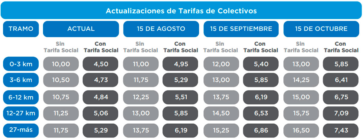 Las nuevas tarifas se actualizarán en forma escalonada: el viaje mínimo en colectivo pasará a costar 1 peso más a partir de este miércoles, 1 peso más el 15 de septiembre y otro peso más desde el 15 de octubre.