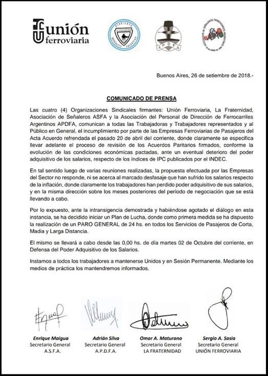 “Se ha decidido iniciar un plan de lucha, donde como primera medida se ha dispuesto la realización de un paro general de 24 horas en todos los servicios de pasajeros de corta, media y larga distancia, que se llevará a cabo desde las 0,00 del día martes 2 de octubre en defensa del poder adquisitivo de los salarios”, explica el comunicado que lleva la firma de los cuatro Secretarios Generales: Enrique Maigua (ASFA), Adrián Silva (APDFA), Omar Maturano (La Fraternidad) y Sergio Sasia (Unión Ferroviaria).