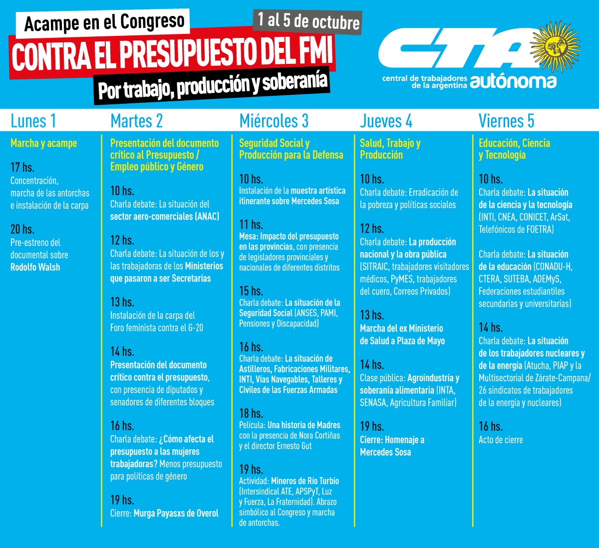 Bajo la consigna “Acampe contra el Presupuesto del FMI; por Trabajo, producción y soberanía”, convocan a un “plan de lucha” contra el proyecto del oficialismo, al que califican “de ajuste”, con una serie de actividades que incluye un acampe frente al Congreso.