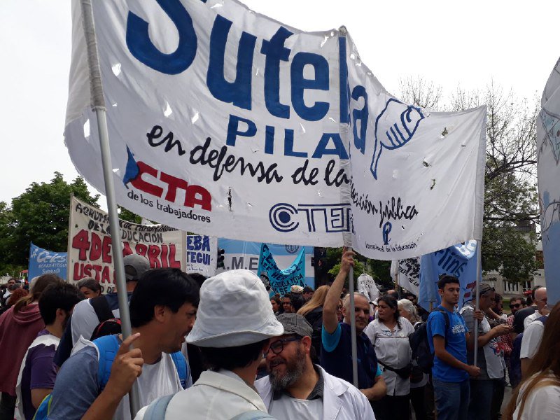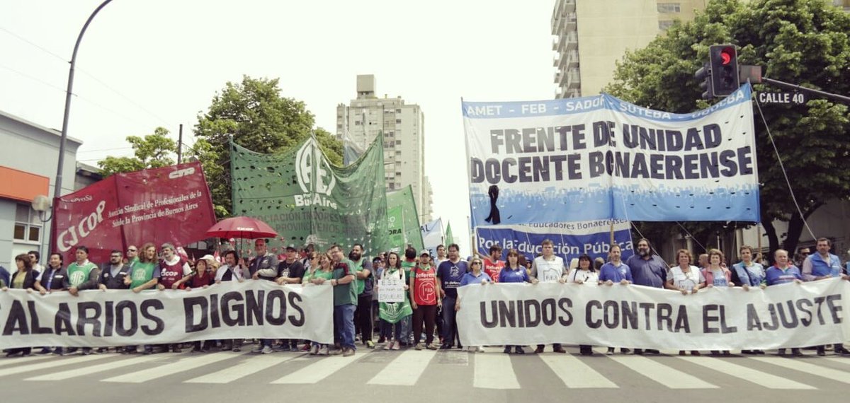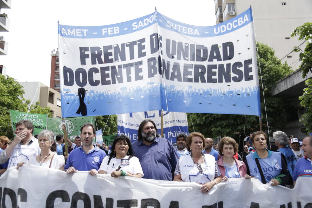 La convocatoria fue encabezada por el Frente de Unidad Docente Bonaerense (FUDB) -integrado por Suteba, FEB, AMET, Sadop y Udocba-, Cicop, ATE y la AJB, quienes reclamaron salarios que alcancen a la inflación y rechazaron el modo “unilateral” de encarar la negociación paritaria la administración de María Eugenia Vidal.