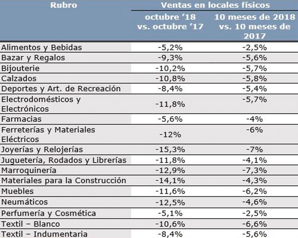 La Confederación Argentina de la Mediana Empresa (CAME) anunció este domingo que las ventas minoristas cayeron 9,4 por ciento en octubre frente a igual mes del año pasado. De esta forma, son 10 meses consecutivos en baja y el descenso acumulado en lo que va del año es de 4,9 por ciento.