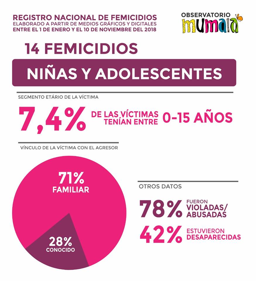 De las 191 mujeres asesinadas, 14 eran niñas y adolescentes menores a 15 años. El 78% de ellas fueron abusadas y el 42% estuvieron desaparecidas. Asimismo, 10 fueron asesinadas por miembros de su familia.