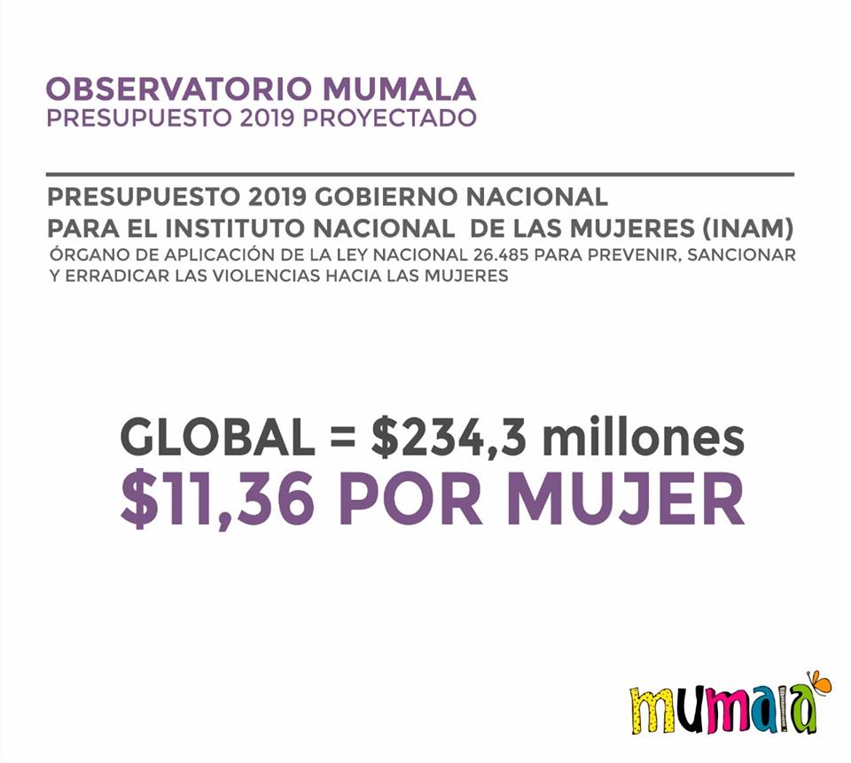 Desde MuMaLá sostuvieron que, “a pesar de la continuidad de la violencia machista en el país”, en Gobierno “destinará en el Presupuesto 2019 la suma de 234,3 millones de pesos al Instituto Nacional de las Mujeres (INAM)”, es decir, “tan sólo $11,36 por mujer”.