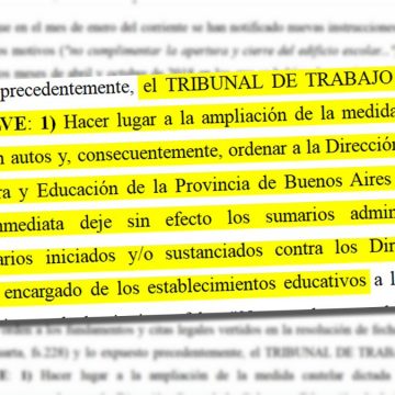 El Tribunal de Trabajo emitió un fallo en el que ordena a la Dirección General de Cultura y Educación de la provincia de Buenos Aires que “deje sin efecto los sumarios administrativos disciplinarios iniciados y/o sustanciados  contra los directores o personal encargado de los establecimiento educativos”. Dicho fallo amplía la medida cautelar de diciembre, incluyendo en la misma cualquier sumario por Escuela cerrada en cualquiera de todas las jornadas de paro convocadas por el Frente de Unidad Docente Bonaerense (FUDB).