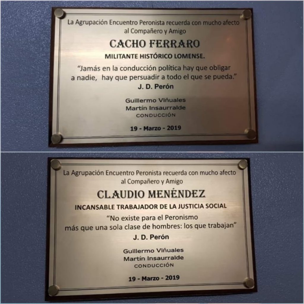 El Jefe de Gabinete de Lomas, Guillermo Viñuales, y el presidente del Concejo Deliberante local, Santiago Carasatorre, encabezaron un homenaje a Juan Carlos “Cacho” Ferraro, histórico militante peronista lomense, y Claudio Menéndez, ex concejal local, quienes fallecieron en diciembre de 2018 y febrero pasado, respectivamente.