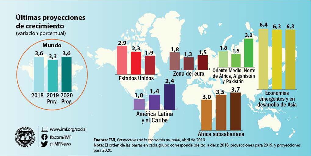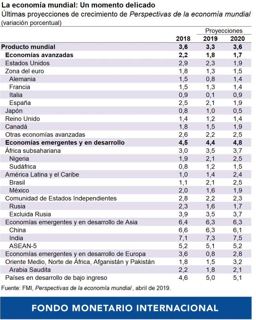 Y agrega: “Como prevemos que esa debilidad persista en el primer semestre de 2019, en Perspectivas de la economía mundial (informe WEO, por sus siglas en inglés) se proyecta una contracción del crecimiento en 2019 para 70% de la economía mundial. El crecimiento mundial, que rozó un máximo de 4% en 2017, disminuyó a 3,6% en 2018 y continuaría esa trayectoria para ubicarse en 3,3% en 2019”.