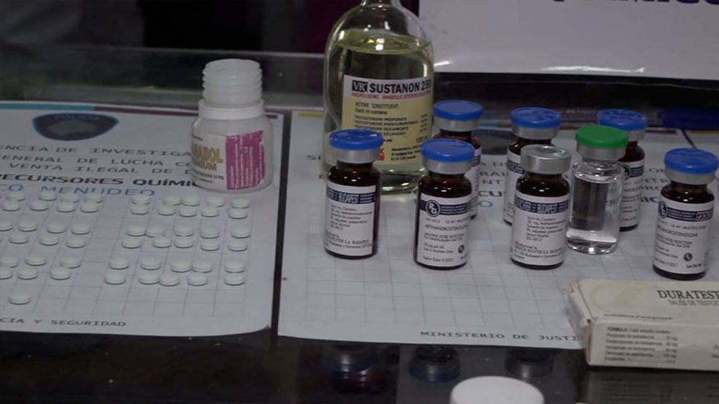 También secuestraron siete ampollas de testosterona, 11 de esteroides, 300 miligramos de la misma sustancia, 100 miligramos de sustanon y 228 pastillas de anabólicos y hormonas.