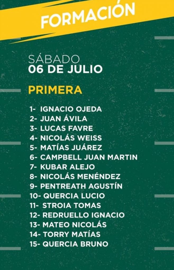 Por lo cual, los quince que saldrán a la cancha serán Ignacio Ojeda, Juan Ávila, Lucas Favre, Nicolás Weiss, Matías Juárez, Juan Martín Campbell, Alejo Kubar, Nicolás Menéndez, Pentreath, Lucio Quercia, Tomás Stroia, Ignacio Redruello, Mateo, Matías Torry y Bruno Quercia.