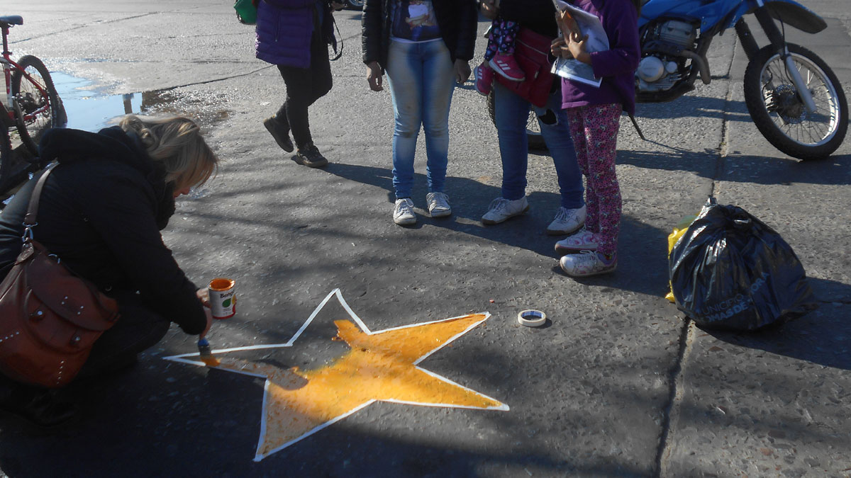 Acompañada por otros familiares de víctimas, Lorena pintó la estrella amarilla prestando atención a todos los detalles y recordando en cada pincelada a su “hijo y compañero”. “Hoy se cumplen 2 años y esto es hacerle un regalo para recordarlo porque lo extraño mucho”, expresó.