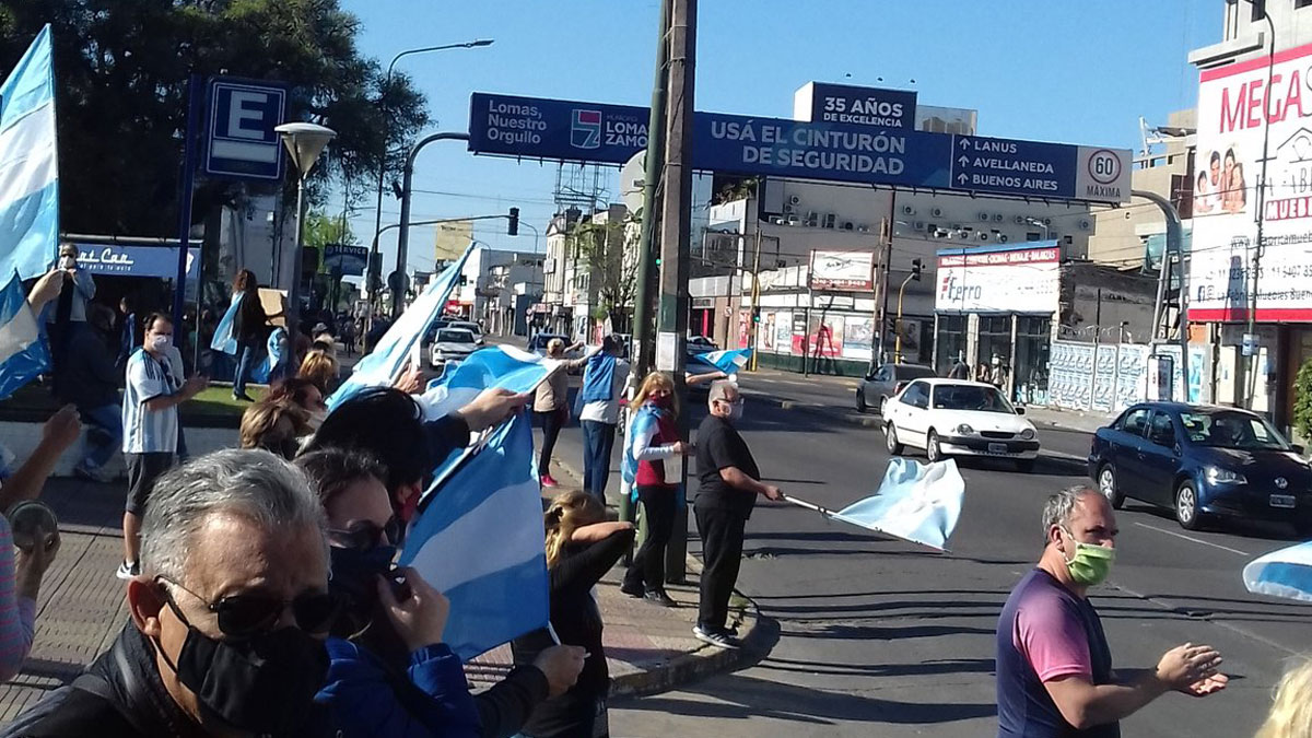 En Lanús, los vecinos del distrito se acercaron a las adyacencias de la estación de trenes para, con banderas y carteles, mostrar su molestia con el Gobierno nacional y con la cuarentena, también cortando la avenida Hipólito Yrigoyen.