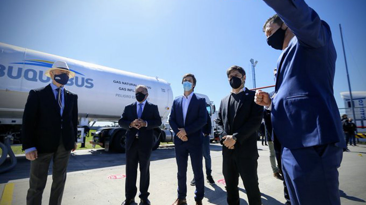 El gobernador de la provincia de Buenos Aires, Axel Kicillof, participó este lunes de un acto en la planta de Gas Natural Licuado (GNL) de la empresa Buquebus en San Vicente, donde destacó que “en medio de la pandemia continúan las inversiones que generan trabajo”.