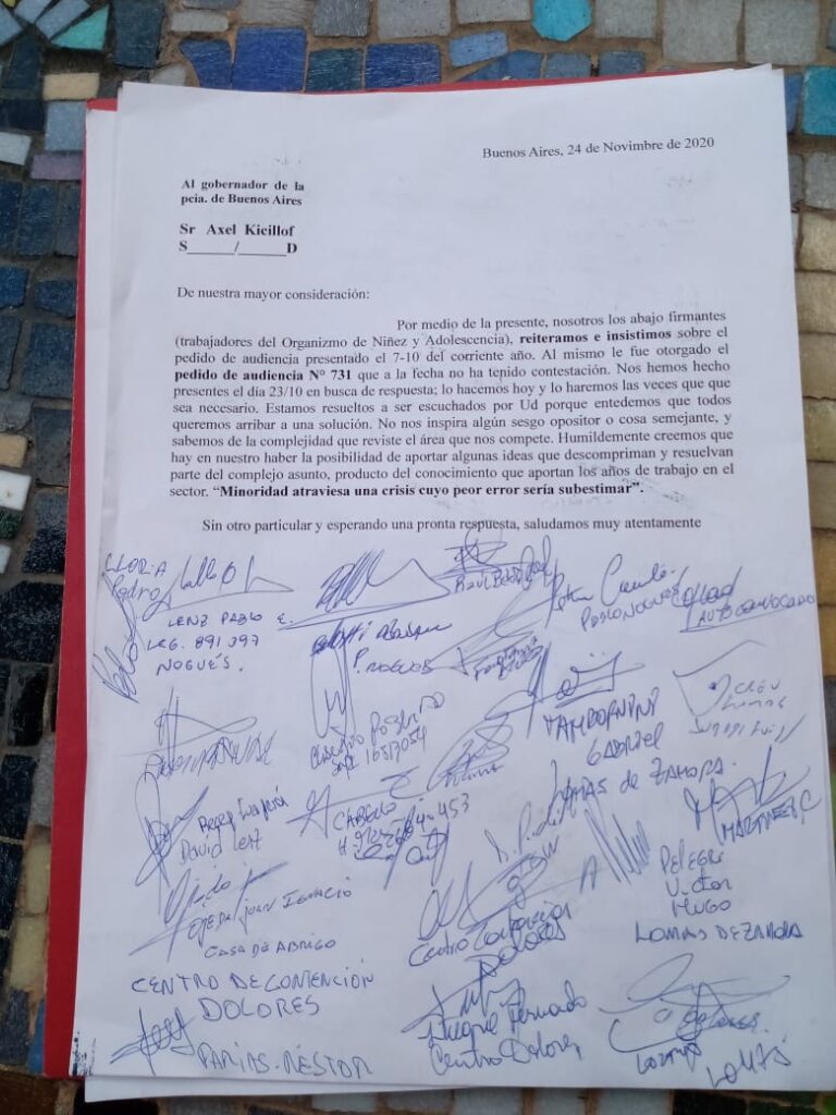El sueldo básico de los trabajadores de institutos penales de la Secretaría de Niñez y Adolescencia era de 10 mil pesos y recibió un aumento del 14 por ciento este año, comentaron trabajadores. “Nosotros estamos por debajo de la línea de pobreza. Pedimos aumento de sueldo y apertura de paritarias, pero también estamos pidiéndole al gobernador (Axel Kicillof) que trate un proyecto de ley que nos comprenda”, enfatizó.