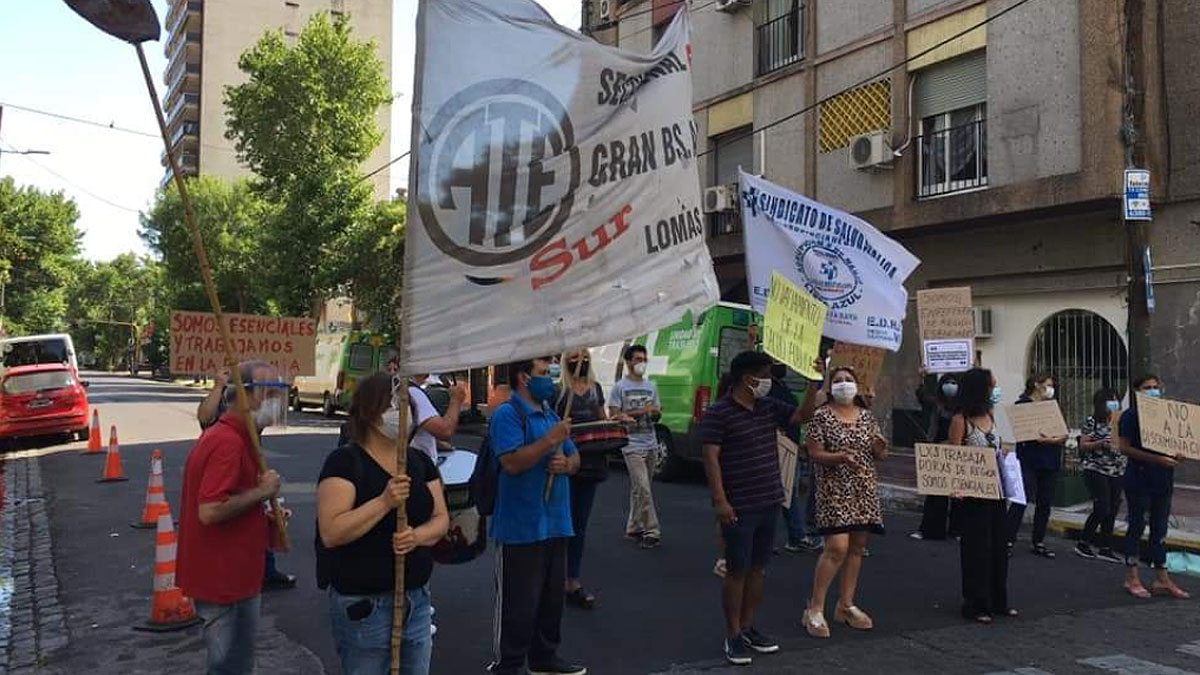 Con banderas y carteles con el lema “somos trabajadores esenciales” y “pago ya del bono nacional”, los empleados sanitarios reclaman que se efectue el pago que “tendría que haber comenzado en abril”.