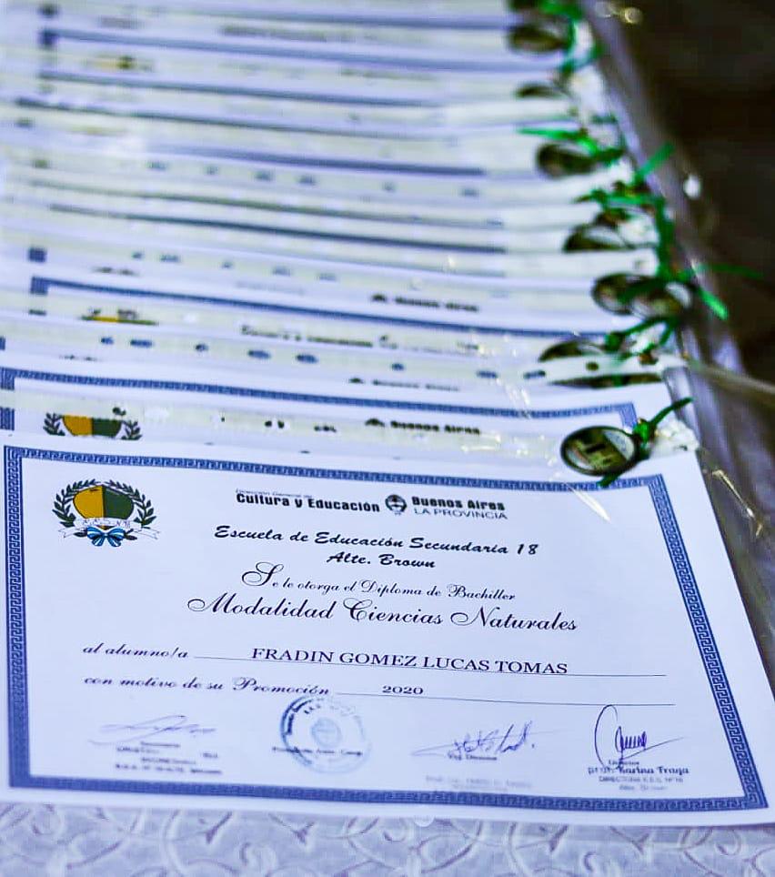 El Municipio de Almirante Brown, por otro lado, precisó que se entregaron 17 mil medallas de egresados a directivos escolares y por iniciativa de algunas instituciones los alumnos recibieron sus distinciones de una manera muy particular, pero no menos gratificante. Numerosas escuelas optaron por entregar las medallas en el domicilio, sorprendiendo a los egresados, mientras que otras desarrollaron el acto presencial, como fue el caso de la Escuela de Educación Secundaria N°18, ubicada en Leonardo Rosales 1980 de Adrogué.