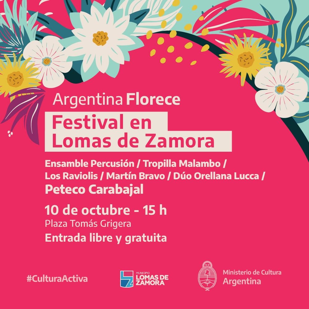Otro festival en Lomas de Zamora que se anuncia para este fin de semana, ya no en el marco del 160º aniversario, es “Argentina florece”, un festival organizado junto al Ministerio de Cultura de la Nación, con la participación de Peteco Carabajal.