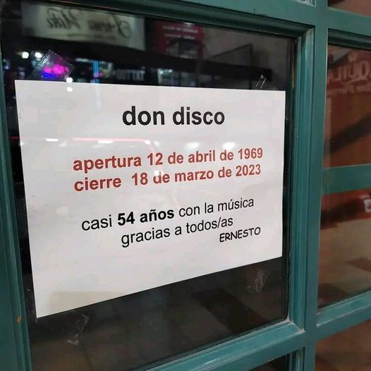 Parecía que ese día nunca iba a llegar, al punto tal que uno pensaba que ya formaba parte del paisaje hasta que un día, un papelito en la puerta con un mensaje tan escueto como los que adornaban los discos de las vidrieras nos recuerda que Don Disco ya tenía 54 años, que Ernesto quería descansar un poco y que “todo tiene un final, todo termina”.