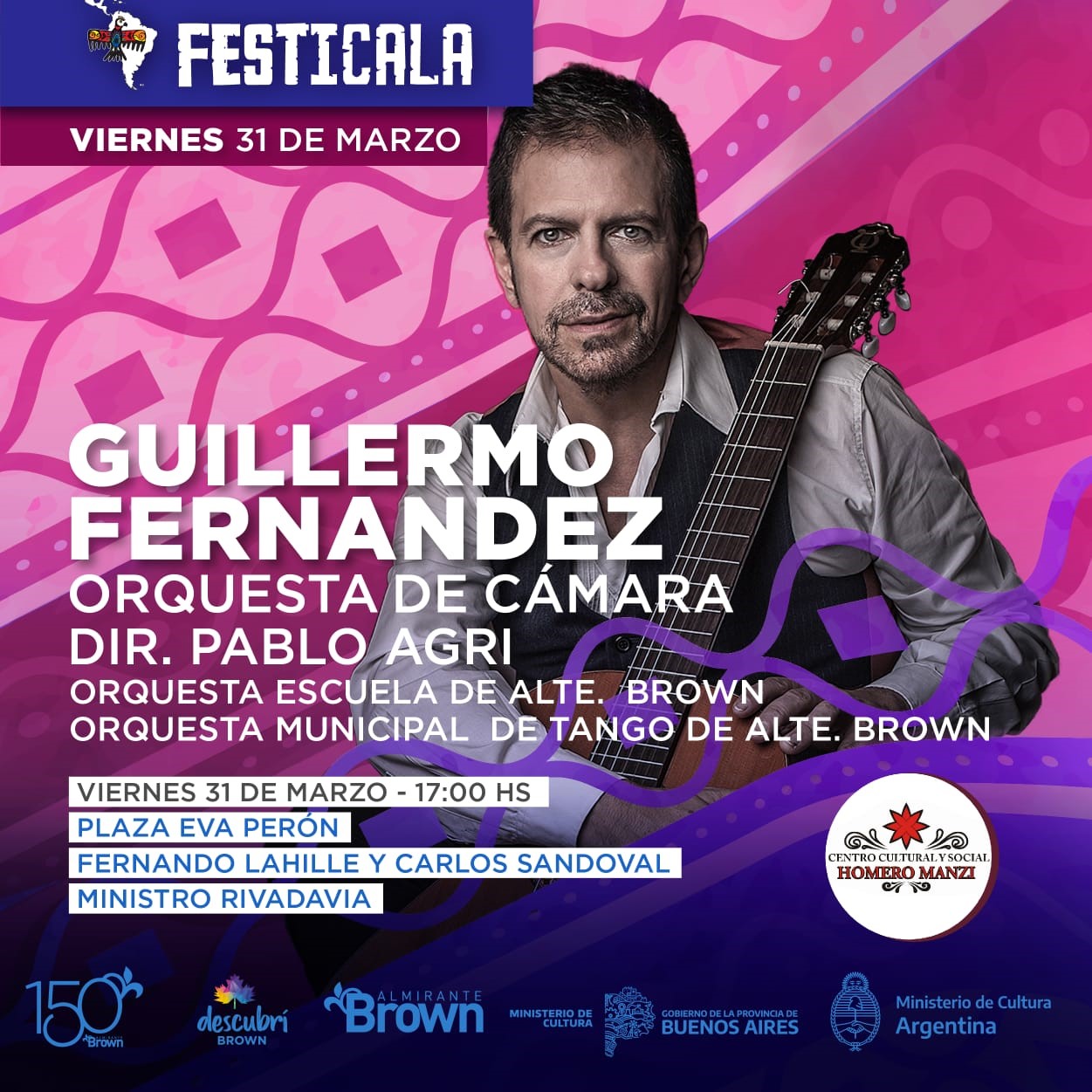 El viernes las actividades comenzarán desde a las 17 y el escenario principal será ocupado por la Orquesta Municipal de Tango de Almirante Brown, la Orquesta Escuela local, la Orquesta de Cámara dirigida por Pablo Agri y un recital a cargo de Guillermo Fernández.