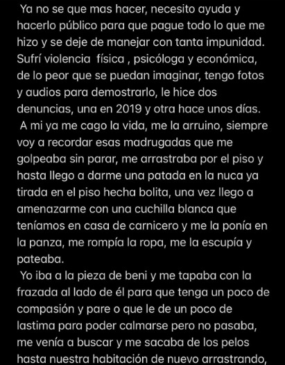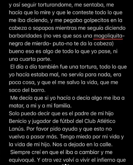 Tras repasar otros hechos de violencia, la joven continuó: “Solo puedo decir que es el padre de mi hijo Benicio y jugador de fútbol del Club Atlético Lanús. Por favor pido ayuda y que esto no vuelva a pasar más. Tengo miedo por mi vida y la vida de mi hijo. Nos dejó en la calle. Siempre creí en que él iba a cambiar y me equivoqué. Y otra vez volví a vivir el infierno que no le deseo a ninguna mujer y menos con un hijo”.