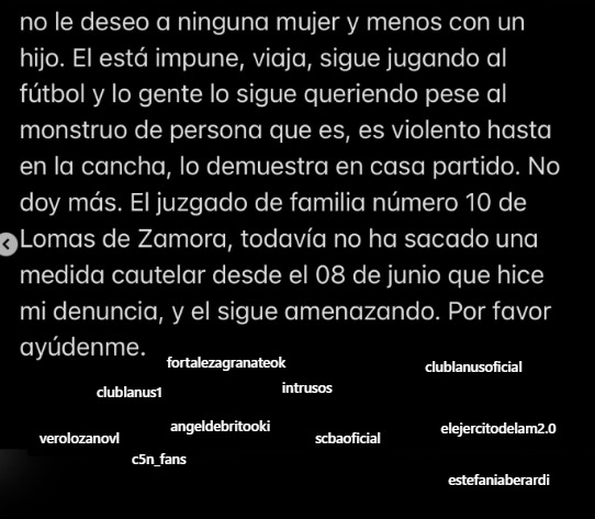 “Él está impune, viaja, sigue jugando al fútbol y lo gente lo sigue queriendo pese al monstruo de persona que es. Es violento hasta en la cancha y lo demuestra en cada partido. No doy más. El juzgado de familia número 10 de Lomas de Zamora todavía no sacó una medida cautelar desde el 8 de junio que hice mi denuncia, y el sigue amenazando. Por favor ayúdenme”, cerró el mensaje que motivó gran cantidad de respuestas.