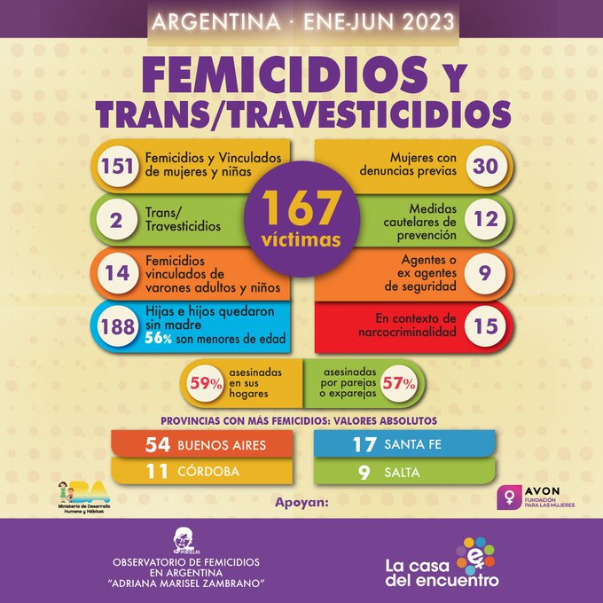 “Desde el 1 de enero al 30 de junio de 2023, hubo 151 femicidios, 2 trans/travesticidios y 14 femicidios vinculados de varones”, detalla el informe del Observatorio de Femicidios “Adriana Marisel Zambrano” difundido esta mañana.