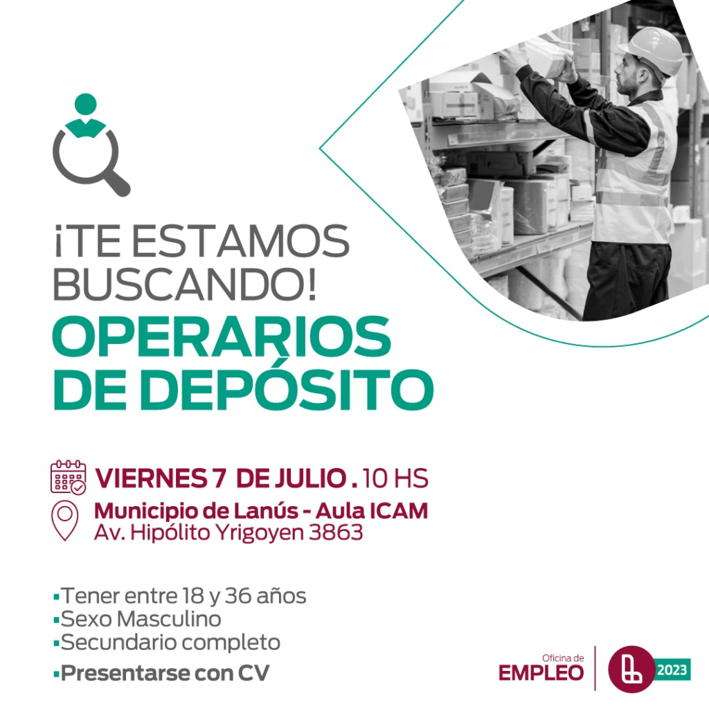 El servicio de Empleo de la Municipalidad de Lanzó hoy una convocatoria laboral a través de la cual invitan a quienes estén interesados en postularse como operarios de depósito acerquen su currículum al a la sede central de la comuna en Avenida Hipólito Yrigoyen 3863, Lanús Oeste.