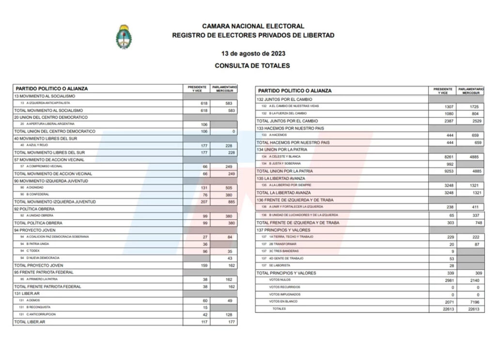 Javier Milei, por su parte, recibió 3.248 votos de personas privadas de su libertad. Y en Juntos por el Cambio, Horacio Rodríguez Larreta – Gerardo Morales consiguió 1.307 votos contra los 1080 de Patricia Bullrich – Luis Petri.