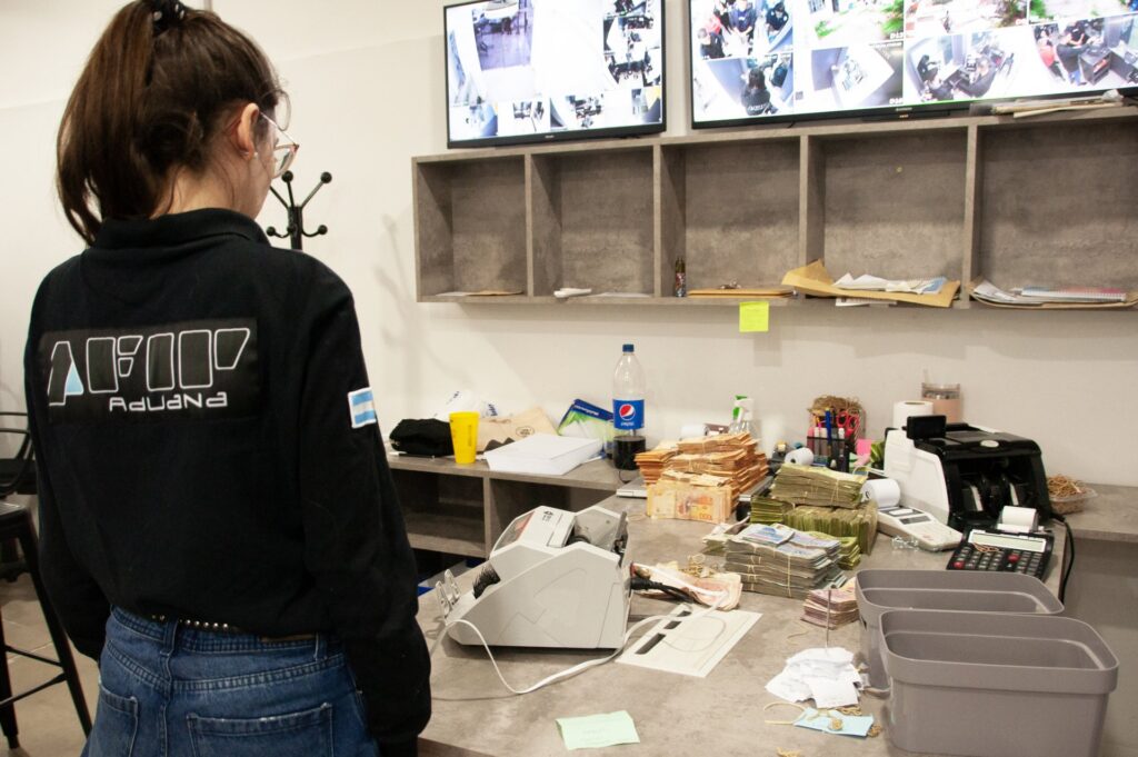Durante los procedimientos se encontraron divisas, pesos argentinos, máquinas de contar dinero y documentación de interés para la causa.