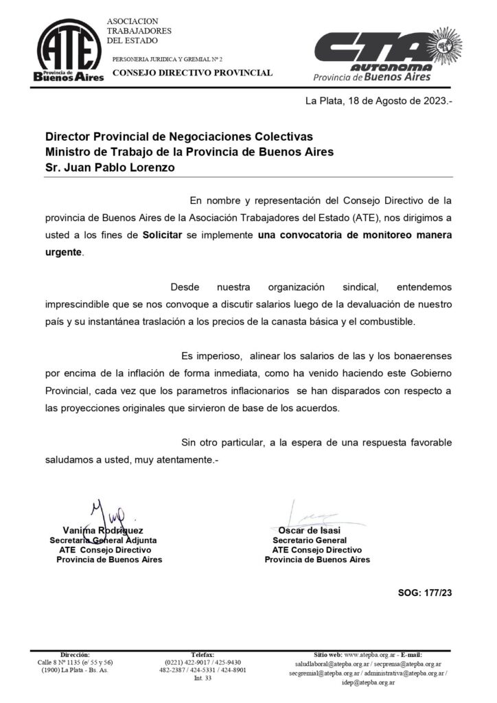 “Entendemos imprescindible que se nos convoque a discutir salarios luego de la devaluación de nuestro país y su instantánea traslación a los precios de la canasta básica y el combustible”, advierte ATE bonaerense en el pedido a las autoridades.
