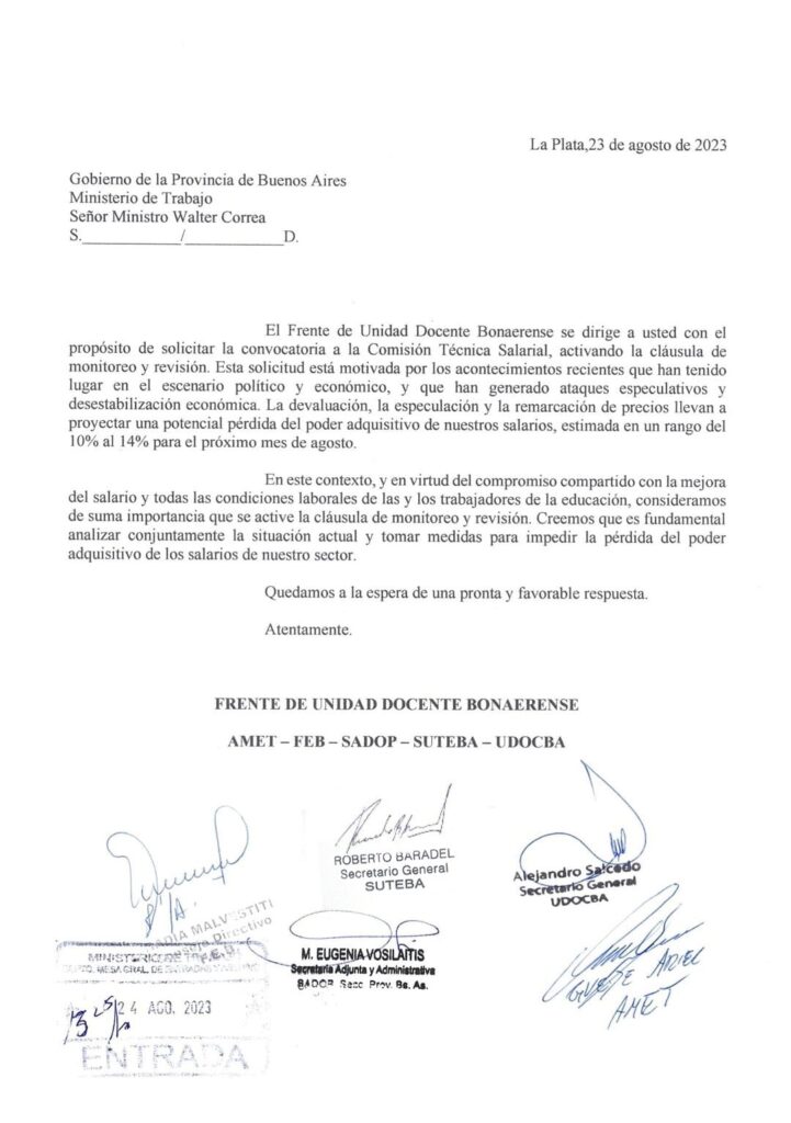 “El Frente de Unidad Docente Bonaerense solicitó al Gobierno de la provincia de Buenos Aires la convocatoria a la Comisión Técnica Salarial, activando la cláusula de monitoreo y revisión vigente en la paritaria. El pedido del FUDB, expresado en una nota al Gobierno provincial, se fundamenta en ´los acontecimientos recientes que han tenido lugar en el escenario político y económico, y que han generado ataques especulativos y desestabilización económica´, con el consecuente incremento de los precios y deterioro de nuestros salarios“, señala el FUDB.