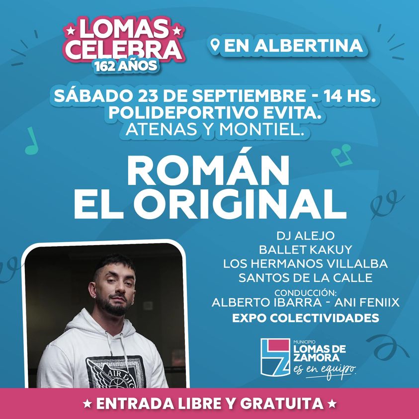 En el marco del aniversario 162 de la creación del partido de Lomas de Zamora, el festival “Lomas Celebra”, con entrada libre y gratuita, sigue su festejo este fin de semana, ahora con cumbia y rap. El sábado se presentará Román el Original y el domingo lo harán los raperos T&K y el Malandro. El festival sigue durante todo el mes de septiembre en todos los barrios del municipio.
