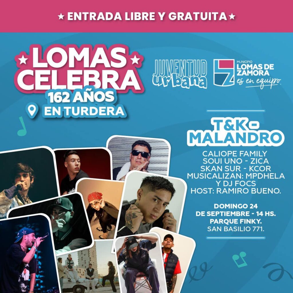 Por el lado del domingo, el “Lomas Celebra” se realizará en el Parque Finky ubicado en la localidad de Turdera. Allí se presentarán los shows de rap y hip hop con artistas reconocidos y locales como T&K oriundo de Temperley y el Malandro. El evento tendrá de host a Ramiro Bueno y será un espectador de lujo con los shows de Caliope Family, Soui uno, Zica, Kcor. Además lo musicalizarán los DJs Mpdhela y DJ Foks.