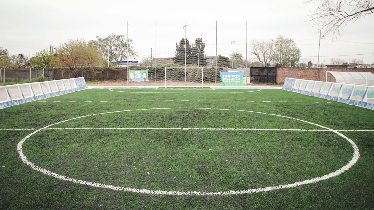 La cancha cuenta con medidas reglamentarias de 42 x 20 metros de césped sintético, y veredas perimetrales de baldosones táctiles de prevención y guía. Además, los vestuarios están adaptados con señalizaciones en braile, parapelotas y banco de suplentes.