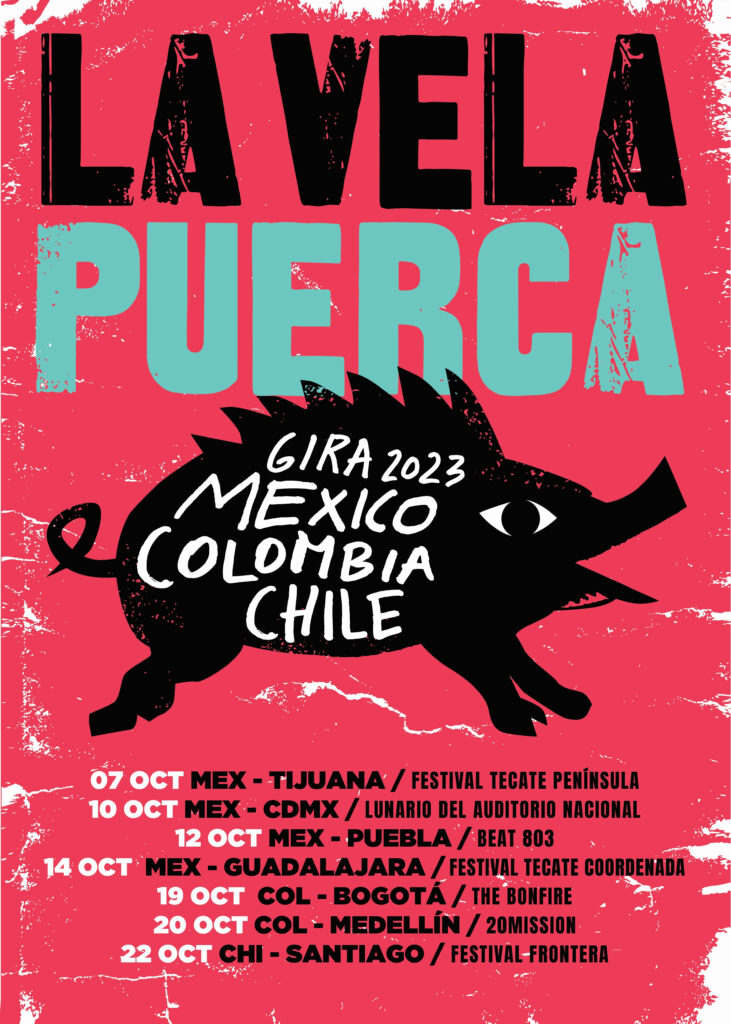 Tras el exitoso recorrido de su gira “Discopática” por Uruguay, Argentina, Paraguay, Chile y Europa, La Vela Puerca no cesa en su búsqueda incansable y se embarca en una nueva travesía por tierras latinoamericanas. Sus próximos destinos incluyen México, Colombia y una segunda visita a Chile, donde desplegarán su poderío en vivo para interpretar todos los clásicos que han emocionado a sus seguidores durante sus 27 años de carrera, así como algunas canciones de su último disco, “Discopático”.