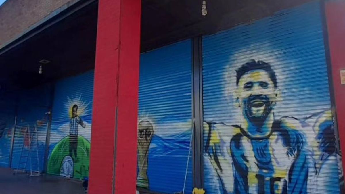 Entre las figuras plasmadas en las persianas de los locales comerciales se encuentra Lionel Messi, la copa del mundo y un nene con una pelota que simboliza la juventud del astro argentino.