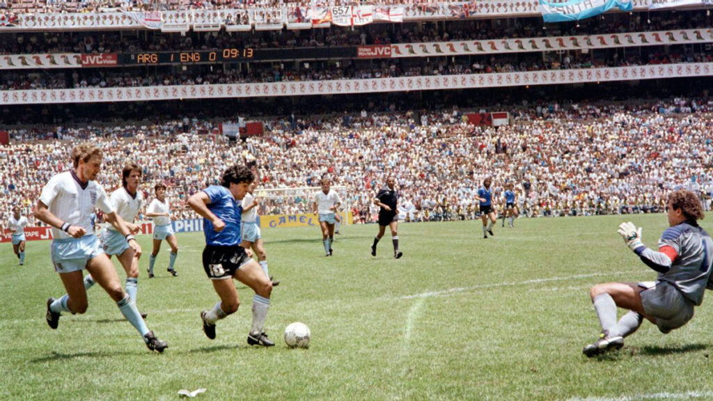 Uno fue con la mano, titulado “la mano de dios” que dejó en claro el potrero del conurbano ganándole al portero ingles Shilton en las alturas golpeando la pelota con su puño y marcando el gol.