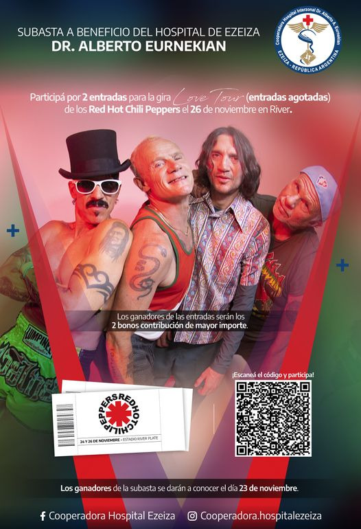 La cooperadora del Hospital Dr. Alberto Eurnekian de Ezeiza usará el fanatismo por el rock como herramienta para llevar adelante una acción destinada a recaudar fondos a través de la subasta por dos entradas para ver a la legendaria banda de rock Red Hot Chili Peppers en el estadio de River el 26 de noviembre en marco de su gira mundial Love Tour.