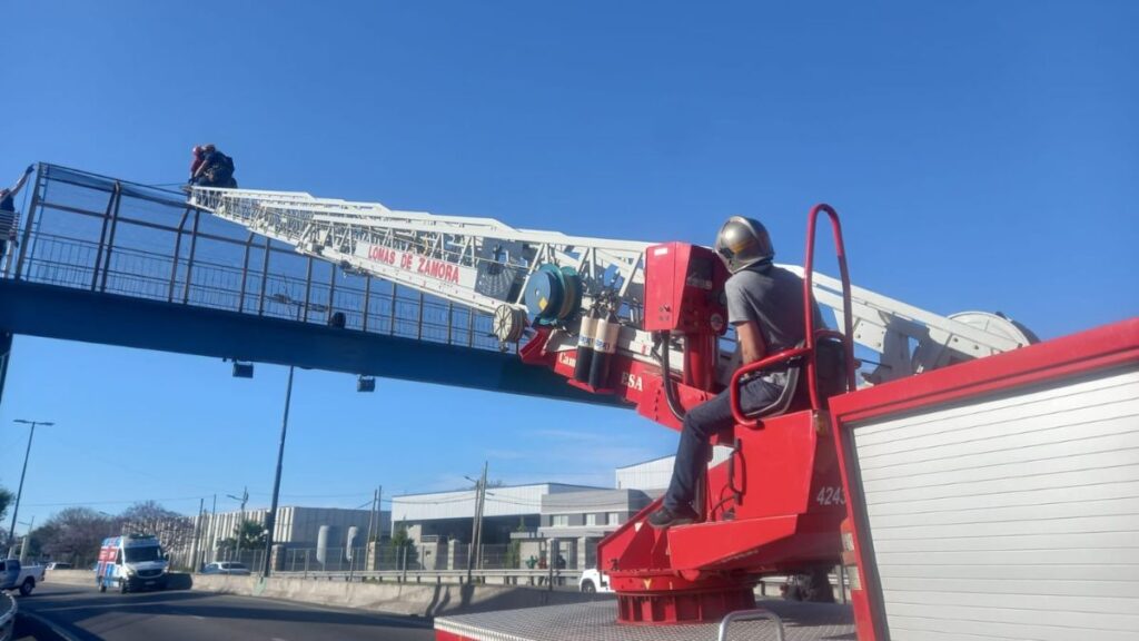 Los Bomberos Voluntarios de Lomas de Zamora realizaron un operativo de rescate en altura para evitar que un hombre se quite la vida arrojándose desde un puente peatonal ubicado sobre la Autopista Presidente Perón y la calle Portela, partido de Lomas de Zamora.
