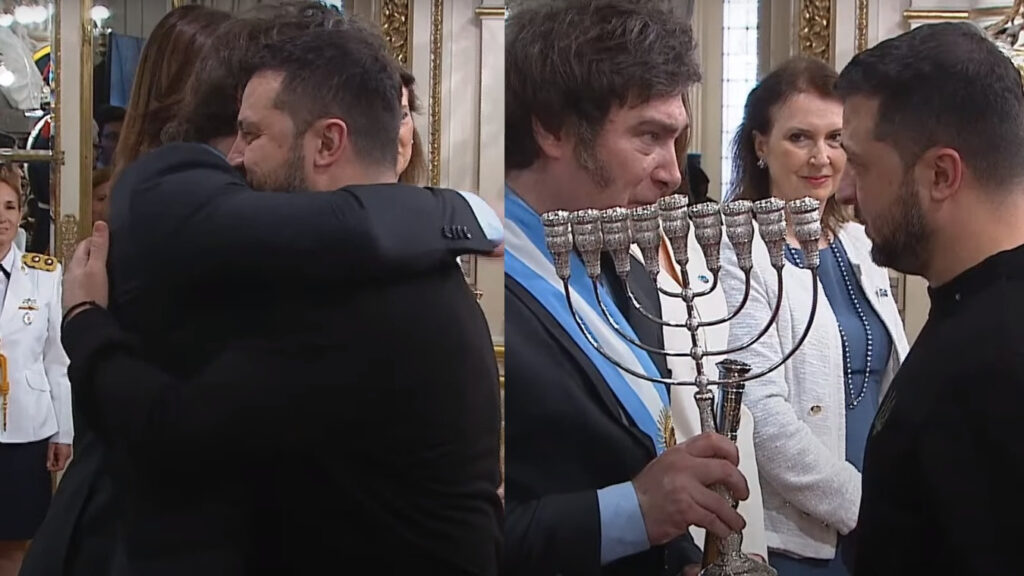 En el saludo en el Salón Blanco, Milei, por fuera del protocolo, le entregó a Zelenski un candelabro denominado januquía que es uno de los principales símbolos del mundo judío en la conmemoración de la Janucá, la festividad que conmemora la rededicación del segundo templo de Jerusalén y la rebelión de los macabeos contra el imperio de los seléucidas.