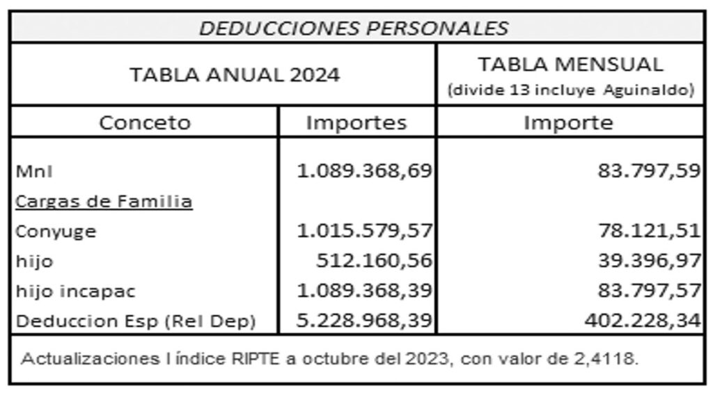 Los importes, tanto de las escalas como de las deducciones personales, se ajustan anualmente (octubre contra octubre) según evoluciona el índice del RIPTE (Remuneración Imponible Promedio Trabajadores Estables).