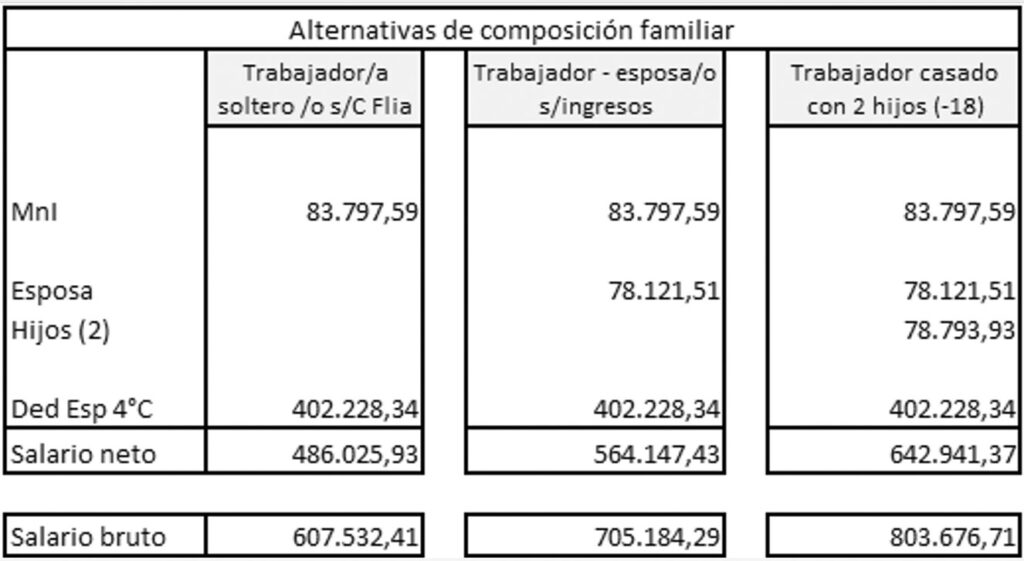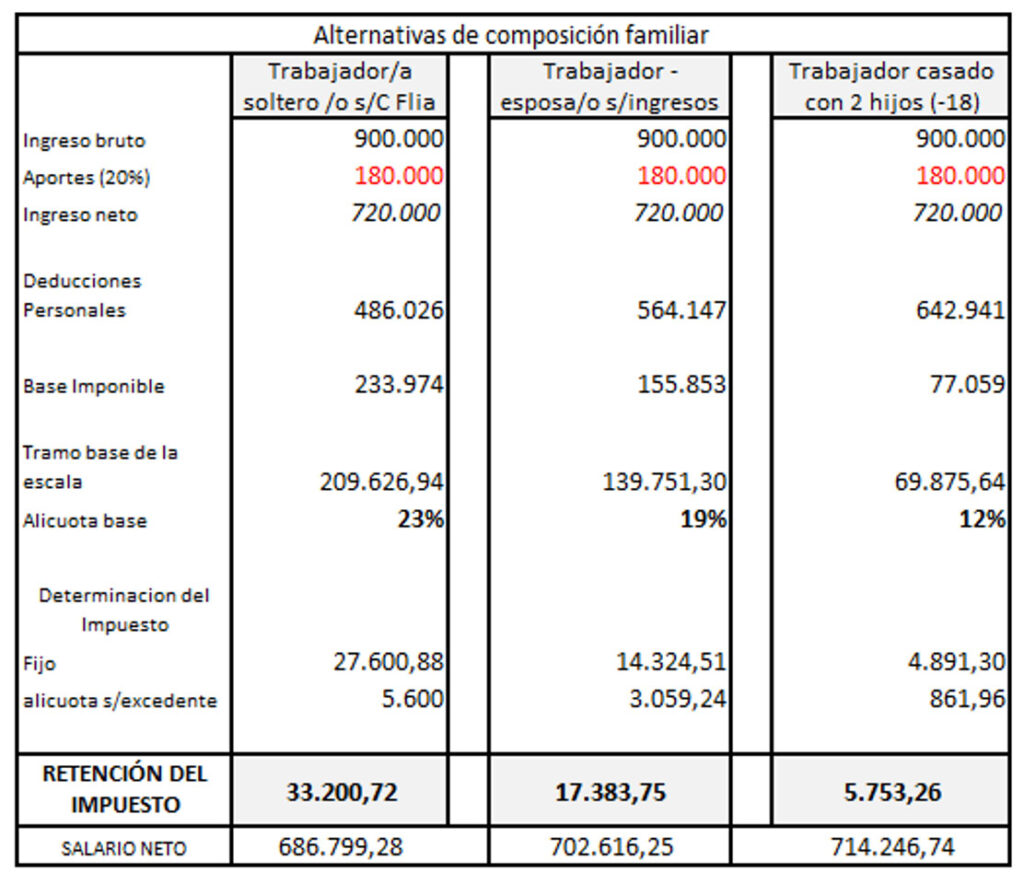 Con esta información estamos en condiciones de mensurar el impacto que tendría la restitución del impuesto a las ganancias en el ingreso de los trabajadores. A manera de ejemplo, abajo se expone en las distintas composiciones familiares, cuánto le será retenido a un asalariado que percibe un ingreso bruto mensual de $900.000.