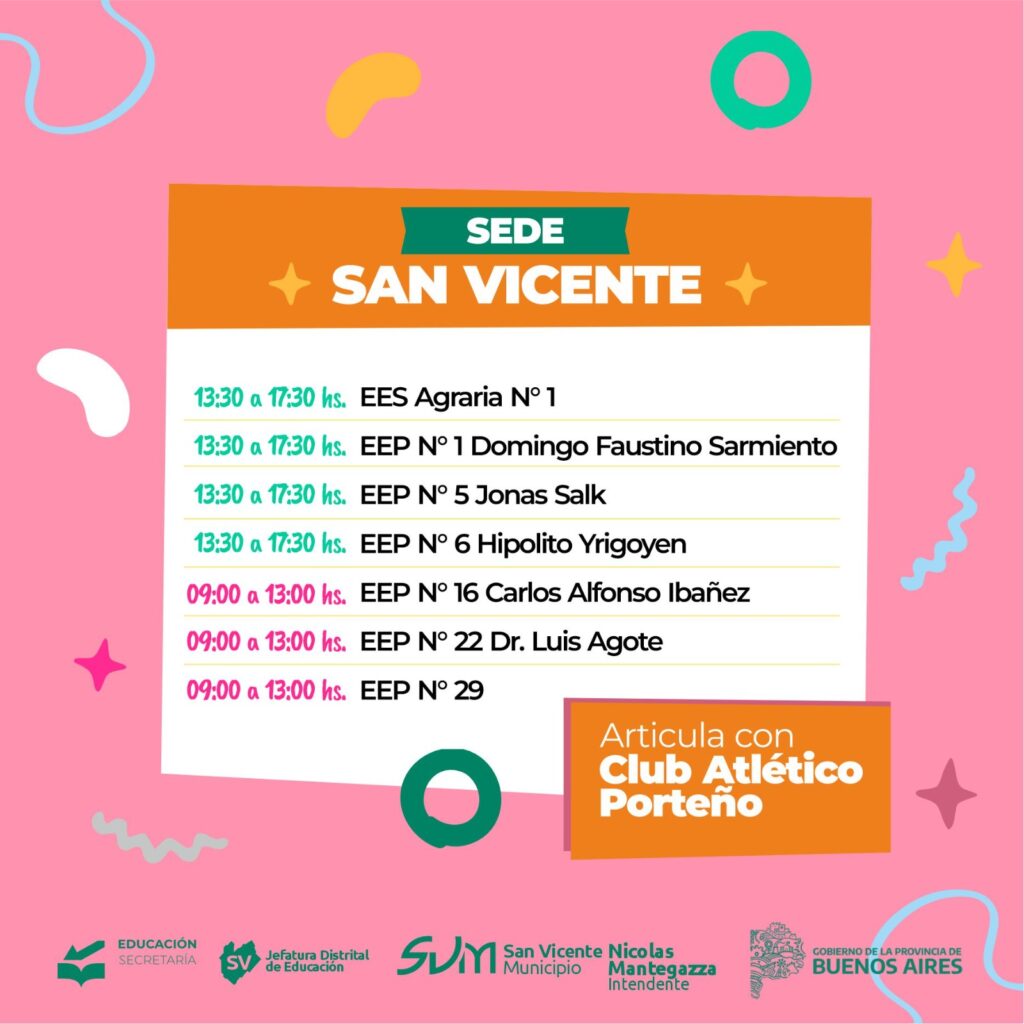 Las Escuela Abiertas en Verano llegan a través de la coordinación del Municipio de San Vicente, a través de la Secretaría de Educación y la Dirección de Deportes; con el Gobierno de la Provincia de Buenos Aires, a través de su Dirección de Cultura y Educación, de la Jefatura Distrital de Educación y la colaboración del Consejo Escolar de San Vicente.