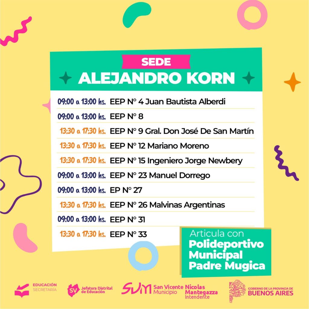 Se encuentra abierta la inscripción para las Escuelas Abiertas en Verano, un programa destinado a alumnos de las ramas primaria y secundaria y que contará con 18 sedes en las tres localidades del distrito donde los participantes realizarán actividades lúdicas, deportivas y culturales e irán alternando con actividades que se llevarán a cabo en las piletas del Club Porteño de San Vicente y en el Polideportivo Municipal, Padre Carlos Mugica de Alejandro Korn.