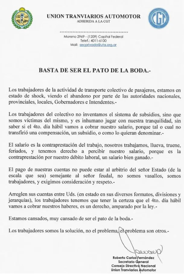 Con el título “Basta de ser el pato de la boda” los choferes de colectivos agremiados en la UTA rompieron puentes entre las cámaras empresariales y el Gobierno a propósito de la negociación por los subsidios, entre otros temas.