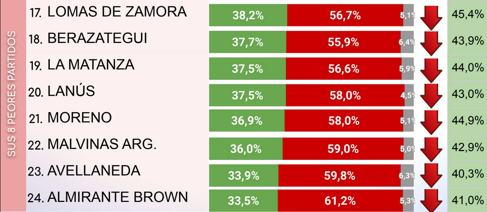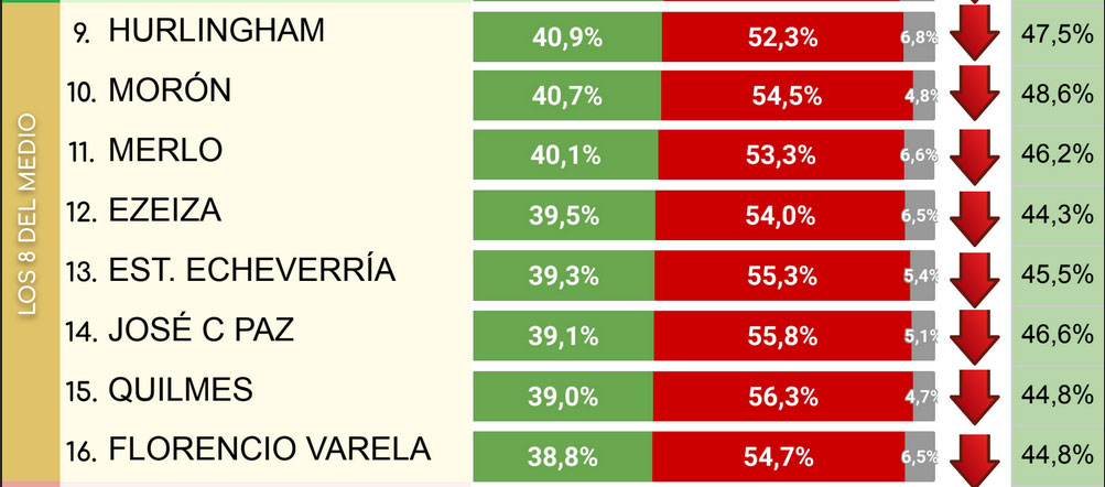 La situación más adversa se concentra en los distritos del sur del Gran Buenos Aires, como Almirante Brown, Avellaneda, Lanús y Lomas de Zamora, que se encuentran entre los ocho municipios con peor valoración para el presidente. En contraposición, el mejor desempeño se observa en la zona norte de la región.