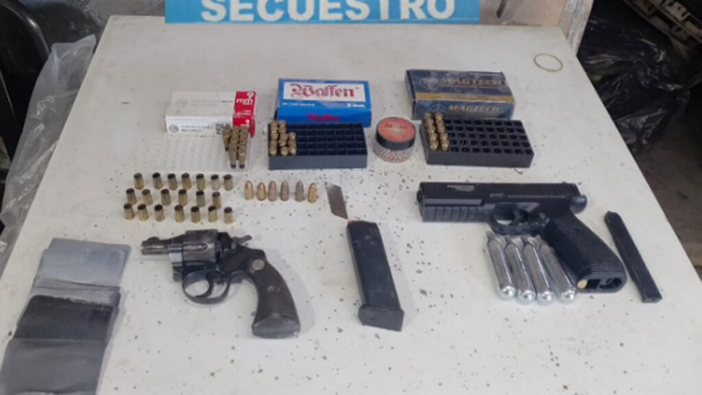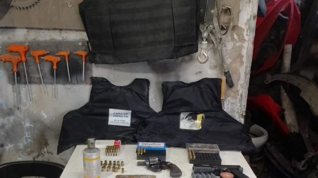 También encontraron un revólver calibre 38, una pistola marca Glock calibre 9 mm, una granada de humo, municiones de distintos calibres y un chaleco antibalas, entre otros elementos de interés para la causa.